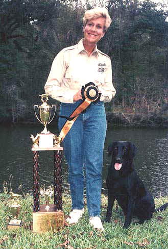 Linda Palmer Weld and GHRCH Pecan Acres Sako Classic MH with their Grand Trophy. Linda was the first woman handler to title a Grand Hunter Retriever Champion dog (GHRCH). Linda handled Classic to 20 points running Derby field trial stakes. Classic received her AKC Master Hunter (MH) title in 1988. Classic was trained and handled exclusively by Linda.