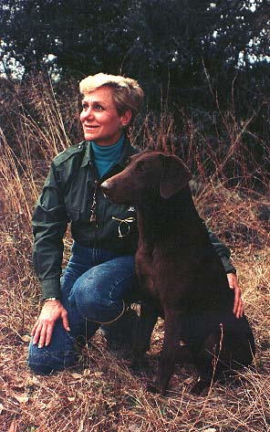 Linda Palmer and HRCH Bad Bad LeRoy Brown. LeRoy received his Hunter Retriever Champion title on January 27, 1991 at age 23 months. LeRoy was trained and handled by Linda. Unfortunately, LeRoy died from a traumatic injury shortly after receiving his HRCH title. He was a talented great young chocolate dog and quite the ham in front of a crowd. |